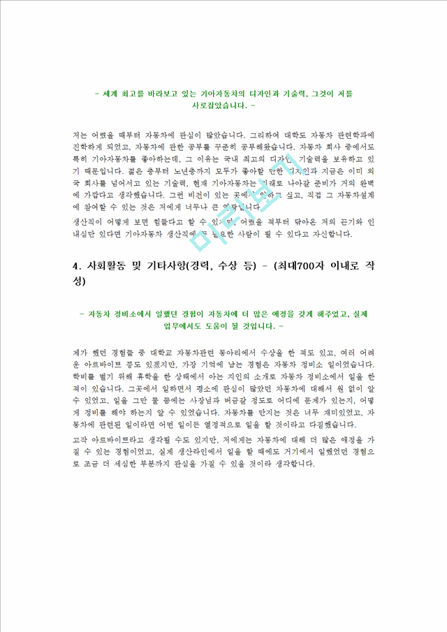 또 다른 지원자는 동아리에서 자동차 프로젝트를 진행했던 경험을 자기소개서에 녹여내어 합격했습니다. 이처럼 기아 킹산직 지원에서 합격을 원한다면 자신만의 노하우와 스토리텔링을 활용해야 합니다.