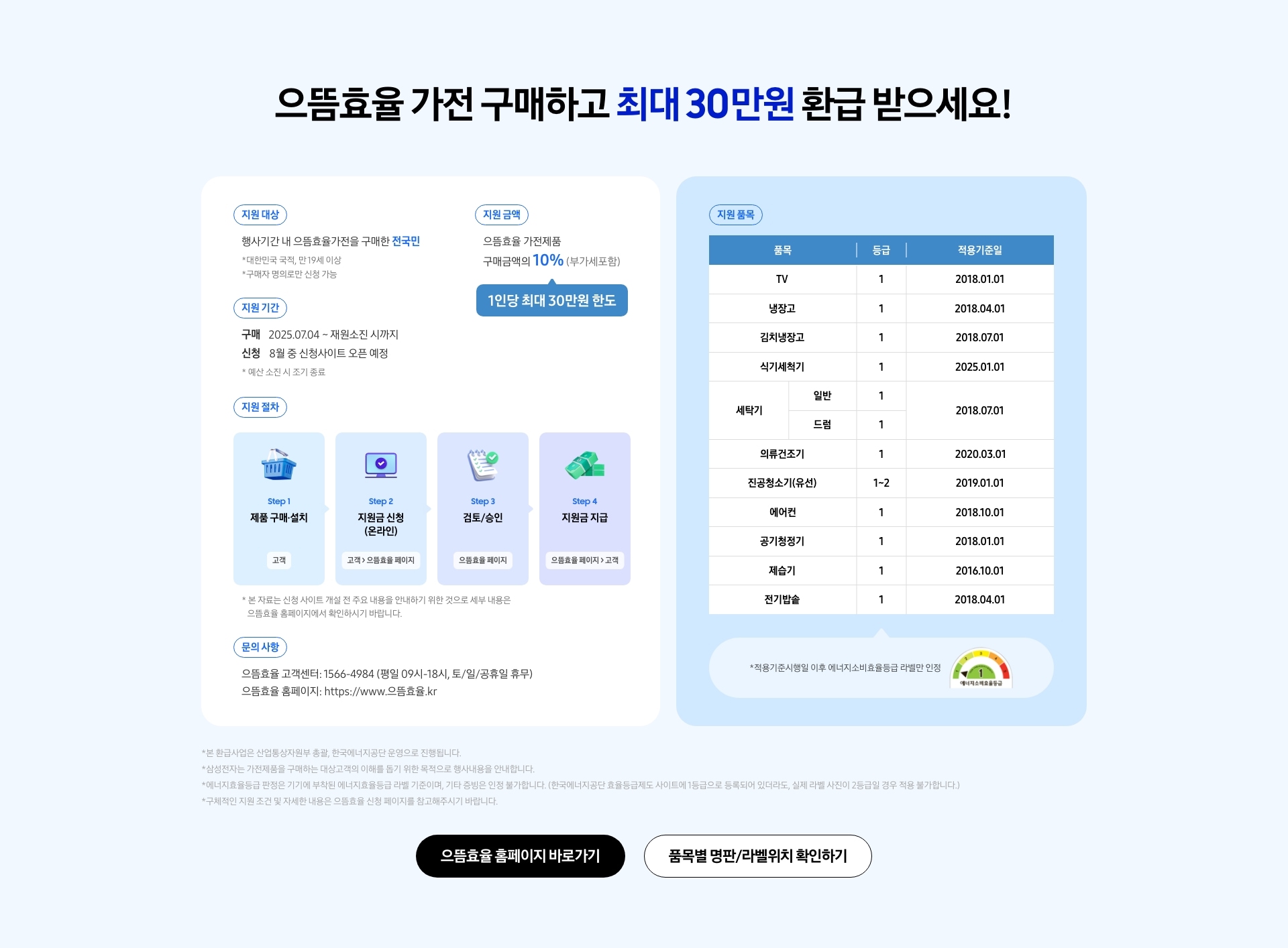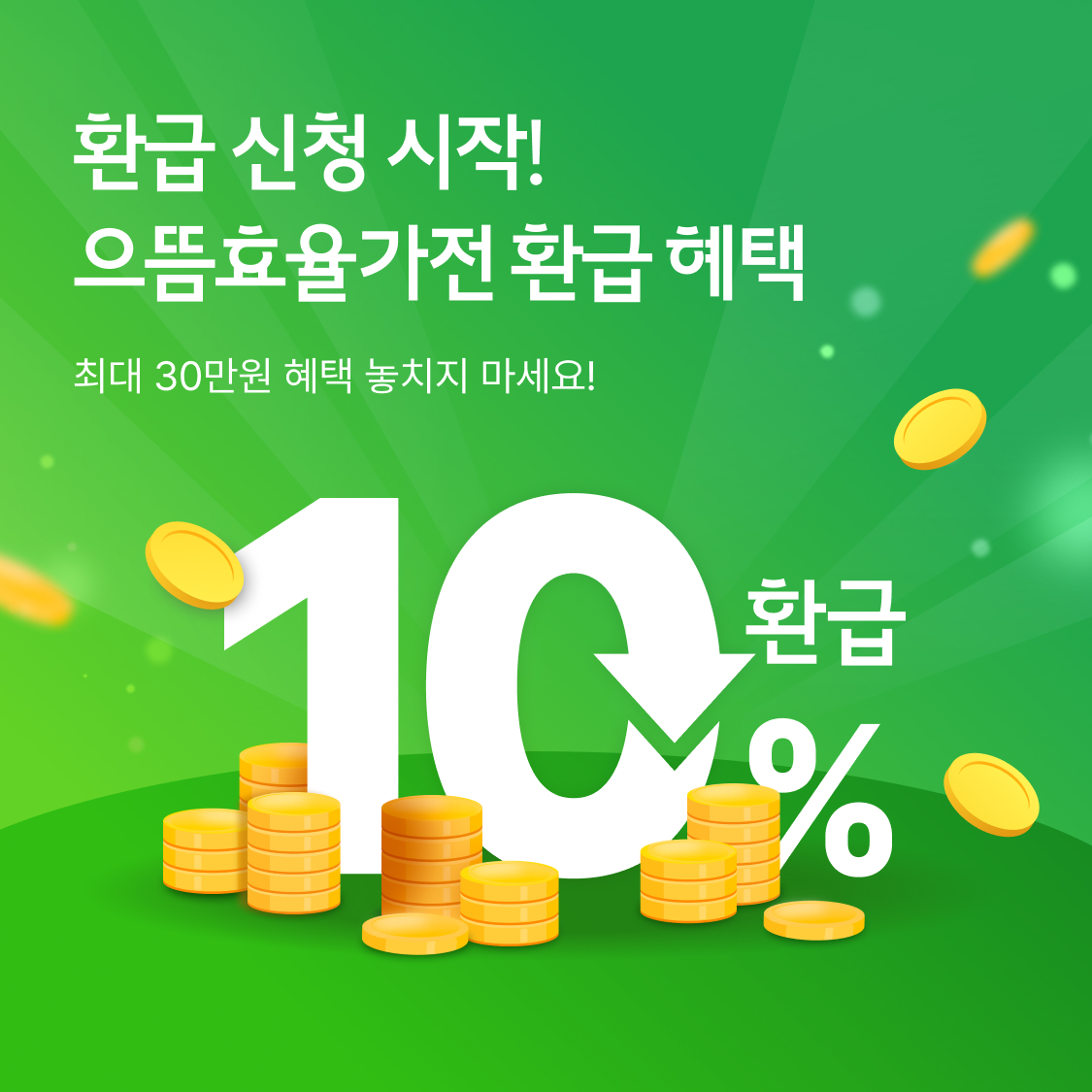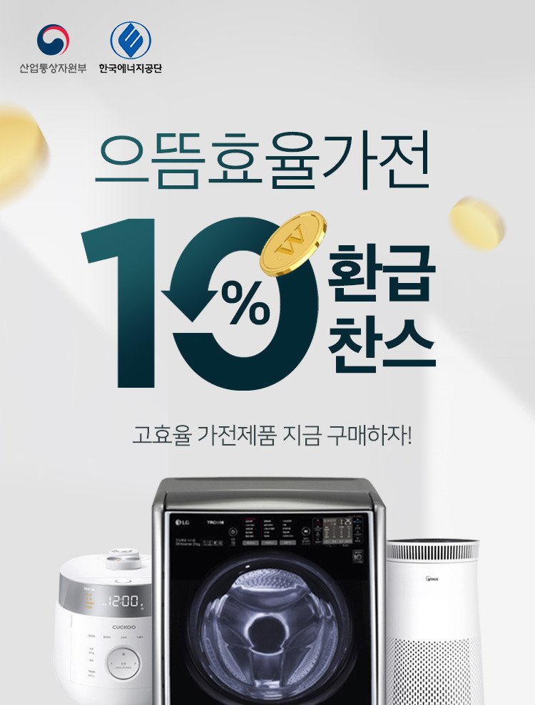 만 19세 이상 대한민국 국민이 TV, 냉장고, 세탁기 등 11개 품목의 최상위 효율 등급 가전제품을 구매할 경우, 구매비용의 10%(개인별 30만원 한도)를 환급해 드립니다.