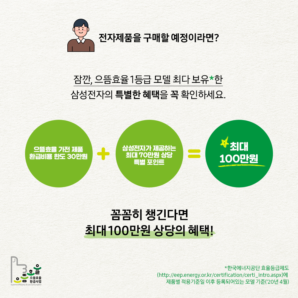 효율이 좋은 에너지효율 1등급 가전제품을 구매하면 구매 금액의 10%, 최대 30만 원을 돌려줍니다.